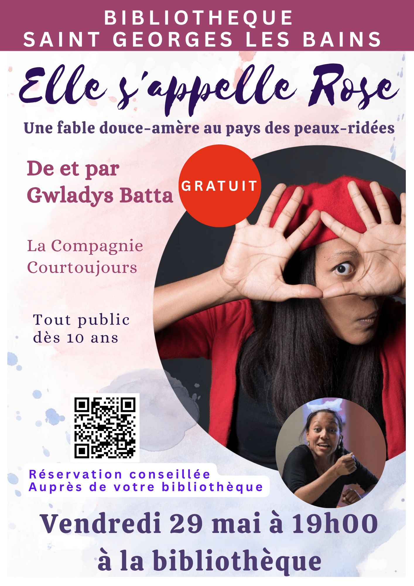 La bibliothèque de Saint-Georges-les-Bains vous propose le spectacle Elle s’appelle Rose, une fable douce-amère au pays des peaux ridées, écrite et interprétée par Gwladys Batta, de la compagnie Courtoujours.